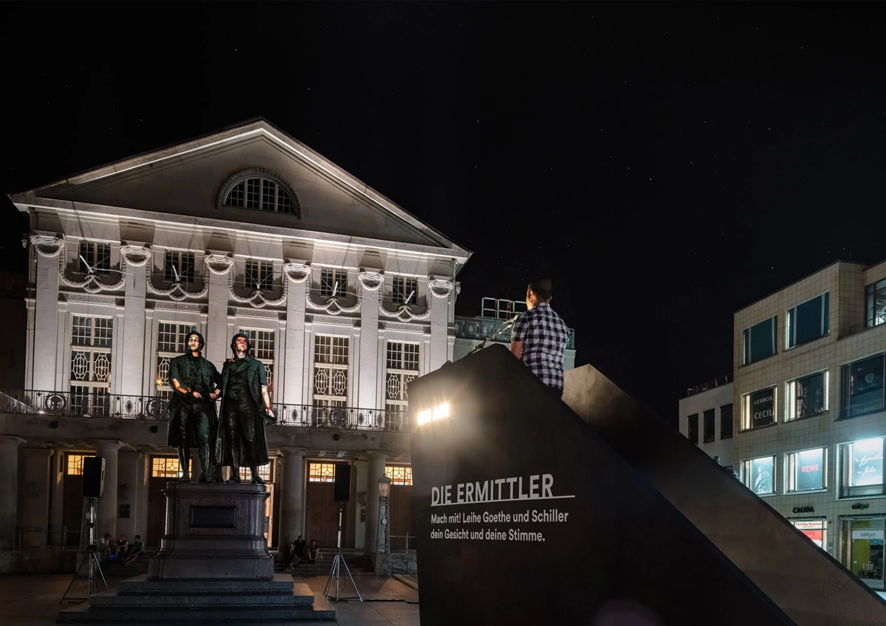 Developed by Kunstfest Weimar and Bauhaus-Universität Weimar, and directed by projection pioneer Krzysztof Wodiczko, Die Ermittler was an interactive projection on the historic Goethe–Schiller Monument presented during the Kunstfest Weimar in 2016.